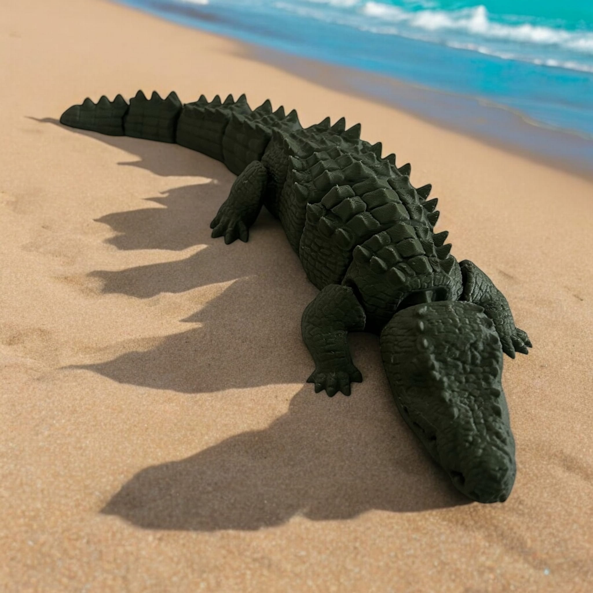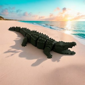 Ruchoma figurka krokodyla charakteryzuje się realistycznym odwzorowaniem cech krokodyla takich jak wyraźne łuski, potężne szczęki czy charakterystyczny kształt ciała. Detale takie jak oczy czy tekstura skóry są precyzyjnie wykonane co nadaje jej autentyczności. Krokodyl mierzy 21cm długości, ma otwieraną szczękę oraz unosi się na wodzie