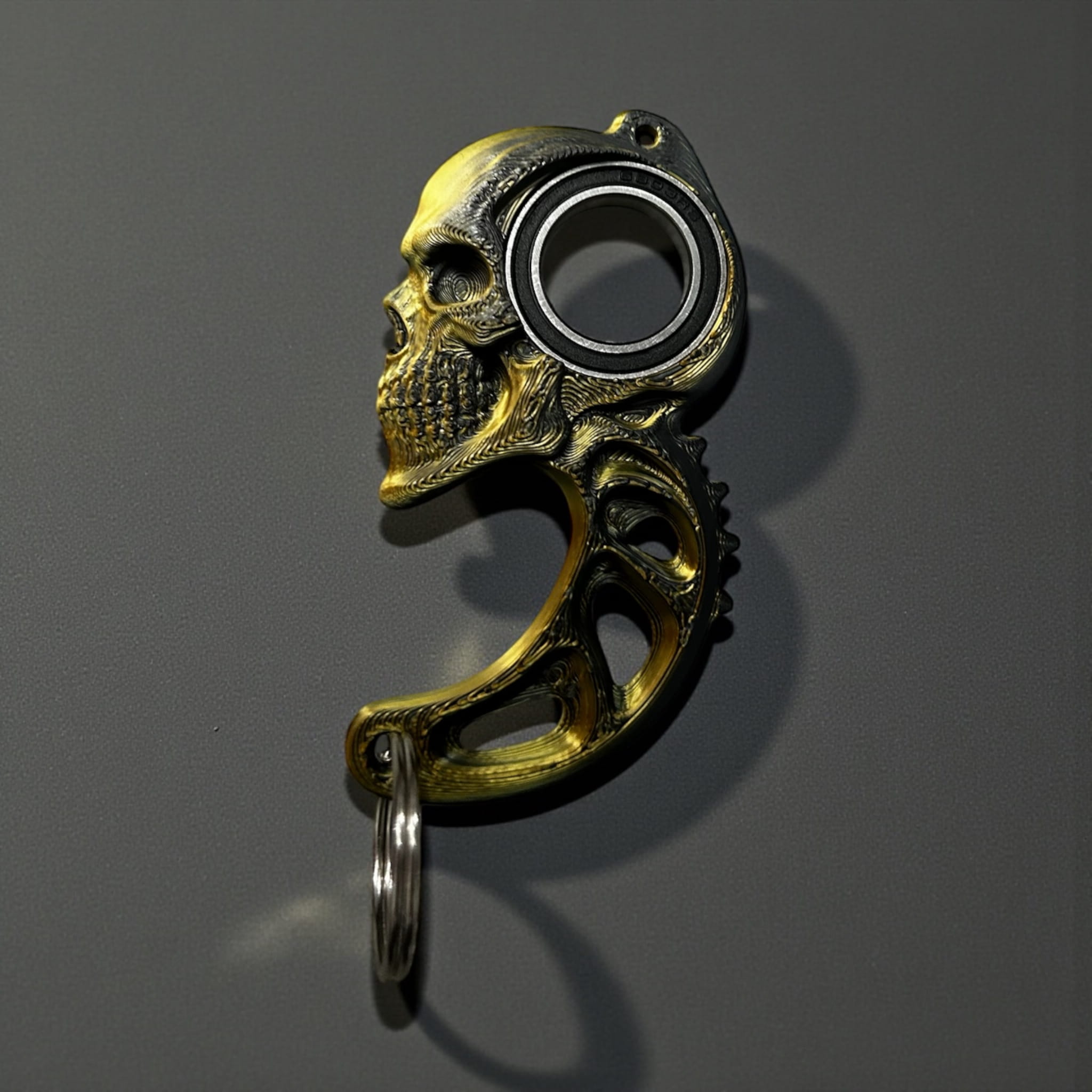 W górnej części znajduje się precyzyjnie osadzony łożyskowany otwór, który pełni funkcję fidget-spinnera – idealny do odstresowania i zajęcia rąk. Konstrukcja jest lekka, a jednocześnie trwała, dzięki czemu świetnie nadaje się do codziennego użytkowania. Do breloka dołączone jest metalowe kółko umożliwiające łatwe przypięcie kluczy.